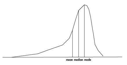 - 我已經知道圖長怎樣且知道中位數在哪裡,要如何得出三者間的關係?眾數是最簡單的,因為只要找到圖的最高峰即是,再來看以中位數為分割線左右兩邊數據的分布情形(為什麼要選中位數為切割線?理由就是為了使左右兩邊的數目相同,如果數目不同,很難去比較左右兩邊離切割線的平均距離大小。)如果左邊是窄而密集,右邊是廣而分散,那麼右邊離中位數的平均距離會大於左邊的平均,因此平均數會比中位數還要偏右;如果相反,則反之。